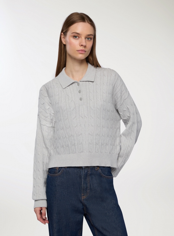 Maglia da donna con design a polo e lavorazione a trecce. Dotata di colletto polo e chiusura con bottoni sul davanti, questa maglia offre una vestibilità comoda e moderna. Perfetta per un look casual, si abbina facilmente a jeans o pantaloni a vita alta, rendendola ideale per diverse occasioni.