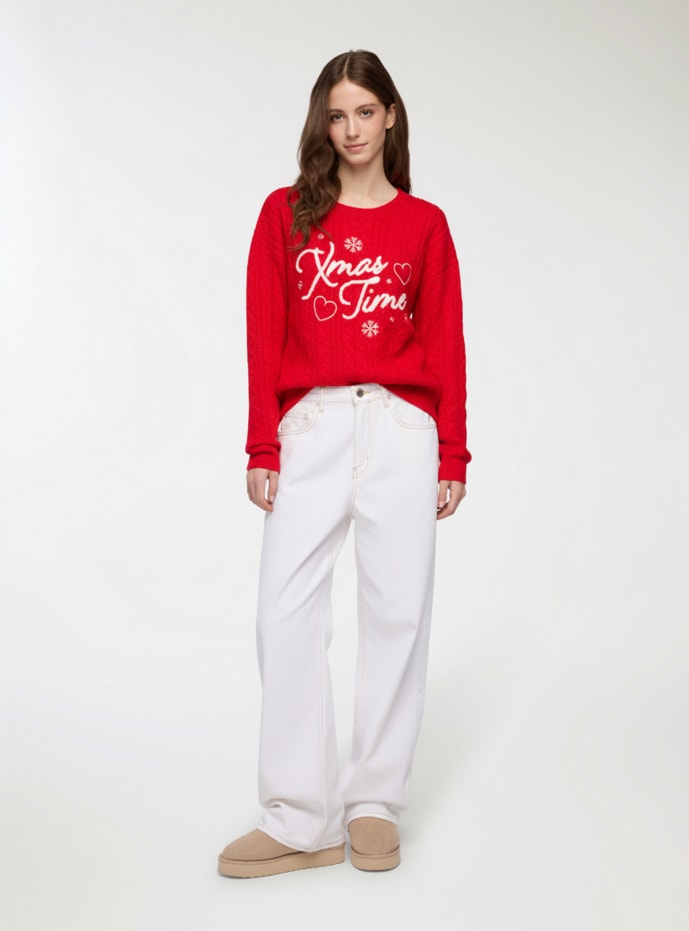 Maglione da donna perfetto per celebrare le feste con stile. Il design natalizio con scritta “Xmas Time”, cuori e fiocchi di neve ricamati lo rende ideale per creare look allegri e festivi. Il motivo a trecce aggiunge un tocco caldo e avvolgente, mentre il taglio regular fit con maniche lunghe e girocollo assicura comfort e versatilità. Da indossare con jeans o gonne per un outfit a tema, ma con gusto.