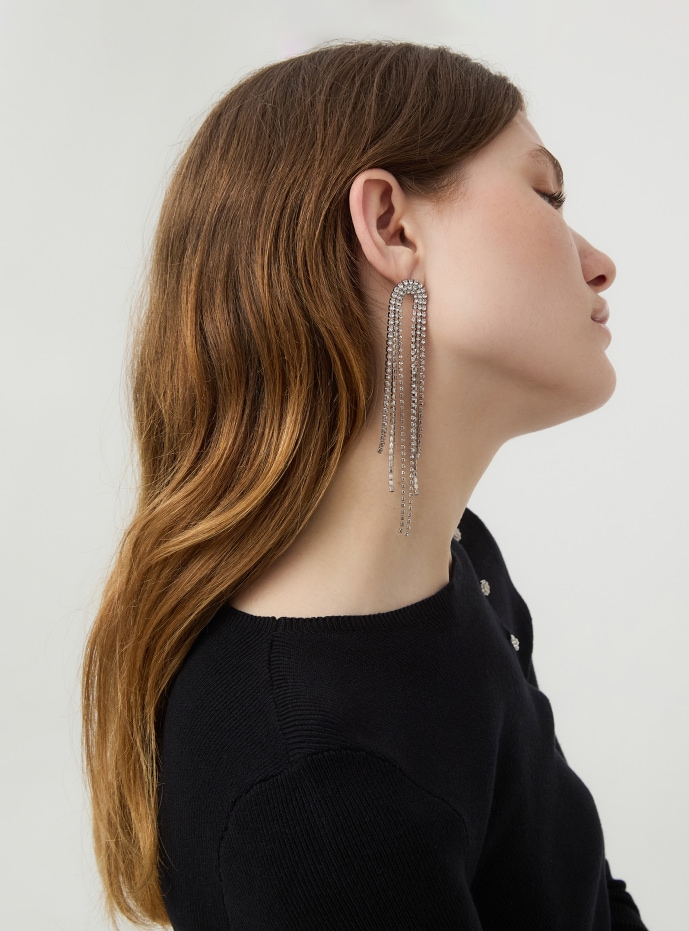Orecchini da donna con design a pioggia, caratterizzati da strass. Ideali per aggiungere un tocco di brillantezza a qualsiasi outfit. La chiusura sicura garantisce comfort e stabilità durante l'uso. Perfetti per occasioni speciali o per dare un tocco di glamour al look quotidiano. Nickel free.