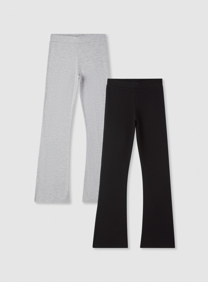 Confezione composta da 2 leggings neri in cotone elasticizzato perfetti per un look chic e versatile. Il design aderisce sui fianchi e si apre verso il fondo in uno stile a zampa, garantendo una vestibilità comoda e alla moda. Le cuciture sono sottili e pulite, senza bottoni o zip per un effetto minimalista. Ideali per occasioni casual o outfit eleganti, questi pantaloni sono un must-have essenziale da avere nel guardaroba di ogni bambina.