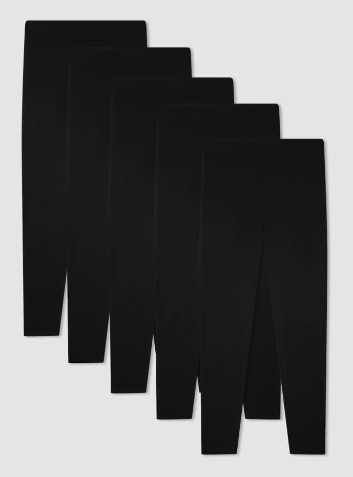 Confezione composta da 5 leggings basic da donna realizzati in tessuto elasticizzato a tinta unita. Offrono una vestibilità aderente e confortevole, perfetta per l'uso quotidiano, garantendo supporto e libertà di movimento.