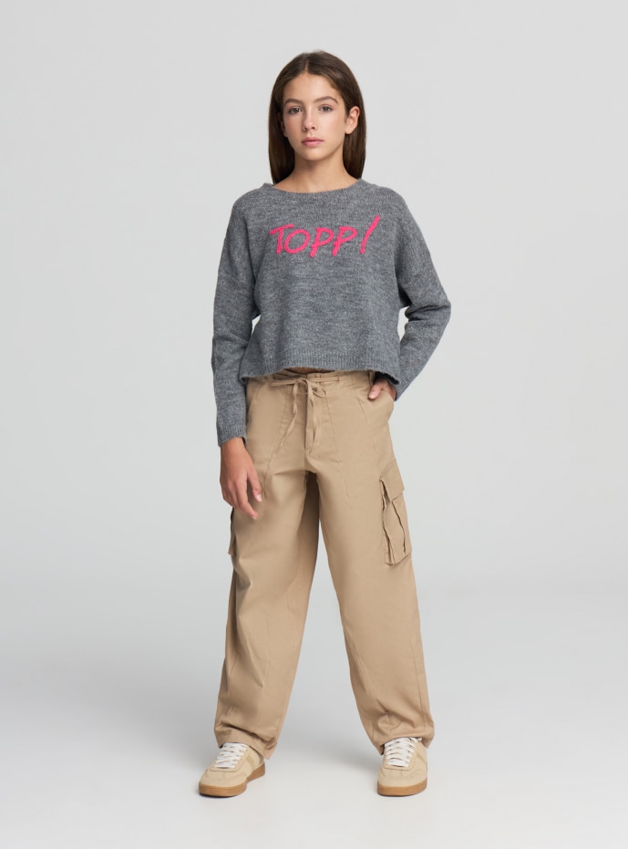 Pantaloni lunghi da bambina in tinta unita, ispirati al modello cargo con tasche laterali a patta e gamba balloon ampia. Vita con coulisse e bottone per una chiusura regolabile, passanti per cintura e tasche oblique. Perfetti per la scuola e il tempo libero, si abbinano a felpe e sneakers per un look casual o a una maglietta e cardigan per uscite in cittá. Vestibilità comoda e silhouette versatile.