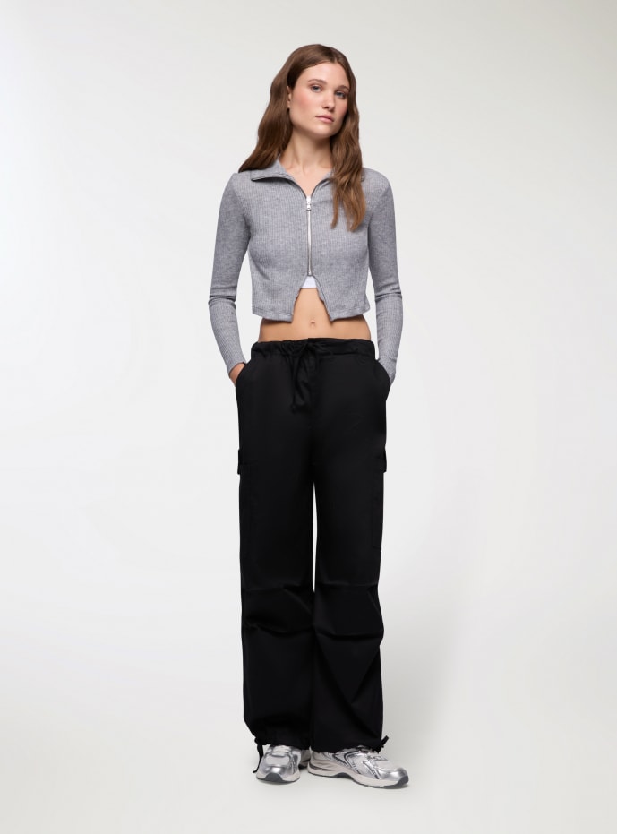 Pantaloni lunghi da donna in tinta unita, stile cargo con vestibilità regular. Vita con coulisse e gamba dritta regolabile al fondo tramite laccetti. Tasche laterali a filetto e ampie tasche applicate sui fianchi, pannelli sovrapposti sulla gamba per un look utility. Perfetti per il tempo libero urbano, si abbinano a maglietta e sneakers o a una camicia morbida per un outfit casual curato.