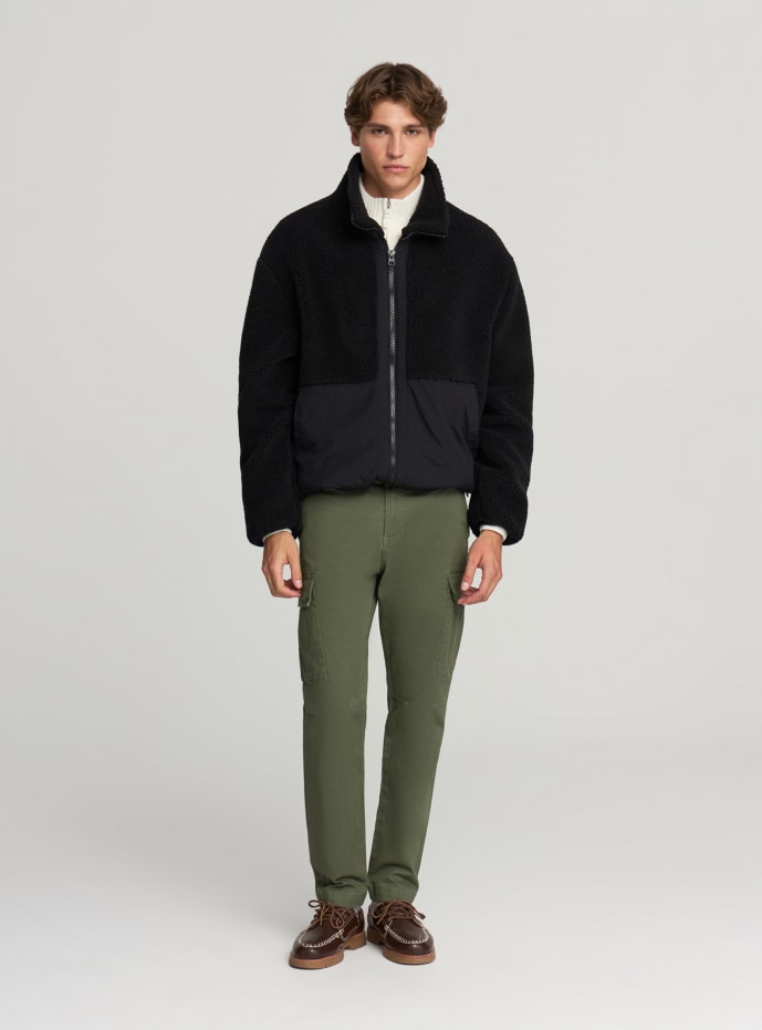 Pantaloni cargo da uomo elasticizzati a tinta unita, ideali per il tempo libero e look urbani. Modello a vita media con chiusura a bottone e zip, passanti per cintura e vestibilità regular con gamba dritta. Presentano tasche alla francese davanti, tasche a filetto sul retro e capienti tasche laterali con pattina. Facili da abbinare a felpe o camicie casual per outfit versatili da città o weekend.