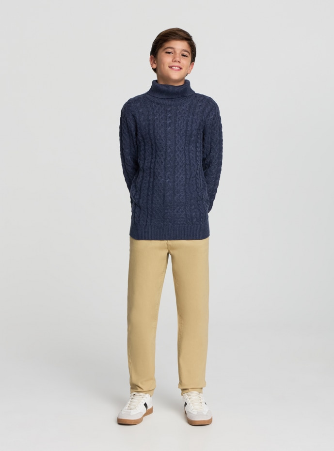 Pantaloni lunghi da bambino in stile chino a tinta unita, perfetti per la scuola e il tempo libero. Vita con passanti, chiusura con bottone e zip. Tasche alla francese davanti e tasche finte a filetto sul retro per un look ordinato. Vestibilità regular con gamba dritta, facili da abbinare a camicie o felpe per outfit curati e versatili.