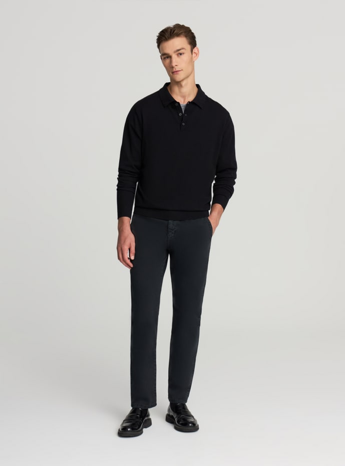 Pantaloni da uomo dal taglio chino, perfetti per il tempo libero e l’ufficio. Vita con passanti e chiusura con bottone e zip. Tasche alla francese. Vestibilità regular e gamba dritta per un look pulito e versatile. Facili da abbinare a camicie, polo o felpe leggere. Fantasia tinta unita.