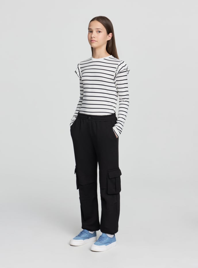 Pantaloni leggeri della tuta da bambina lunghi e comodi, ideali per il tempo libero e le attività quotidiane. Modello parachute cargo. Presentano una vestibilità regolare con tasche laterali cargo per maggiore praticità. La vita elasticizzata con stopper garantisce comfort e adattabilità. Perfetti per creare outfit casual e sportivi.