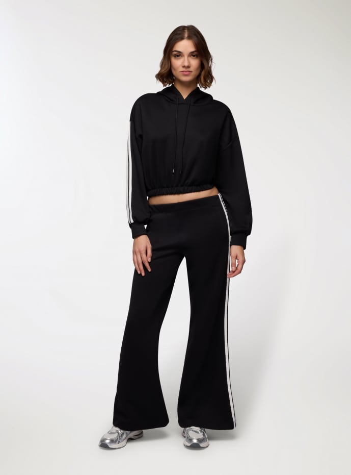 Pantaloni tuta da donna in tinta unita dal taglio wide leg. Vita elasticizzata per comfort quotidiano e libertà di movimento. Dettagli di bande laterali che slanciano la silhouette e aggiungono un tocco sportivo. Facili da abbinare a felpe con cappuccio o magliette per look casual, ideali per il tempo libero e per outfit urban. Tessuto leggero.