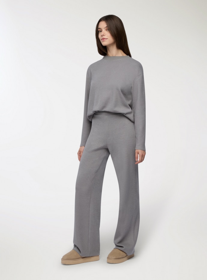 Pantaloni da donna in maglia a tinta unita, con gamba ampia e linea fluida. Il design presenta vita elasticata senza chiusure, ideale per il comfort quotidiano. Lunghezza lunga alla caviglia, perfetti con maglietta aderente o cardigan per look casual o da tempo libero. La vestibilità è morbida e rilassata, senza tasche, pensata per accompagnare i movimenti e valorizzare silhouette e comodità.