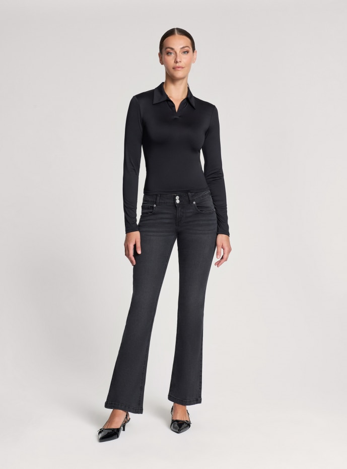 Maglietta da donna a manica lunga, ideale per un look casual e versatile. Presenta un colletto classico e una scollatura a V, perfetta per abbinamenti con jeans o pantaloni eleganti. La vestibilità è comoda e il design tinta unita la rende adatta a diverse occasioni, dal lavoro al tempo libero.