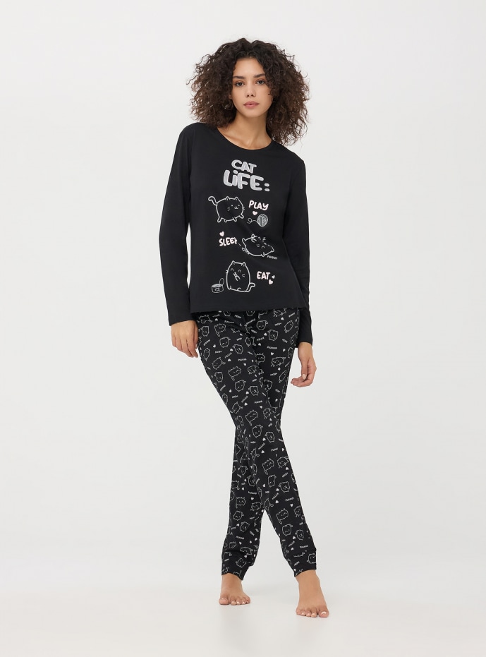 Morbido e confortevole pigiama da donna nero in cotone, composto da maglia a maniche lunghe e pantaloni lunghi. La maglia presenta una simpatica grafica con gattini e la scritta "Cat Life: Play, Sleep, Eat", mentre i pantaloni sono decorati con un pattern di gattini e scritte. La vestibilità è comoda e rilassata, ideale per notti serene o momenti di relax a casa. Pigiama perfetto per le cat lovers.