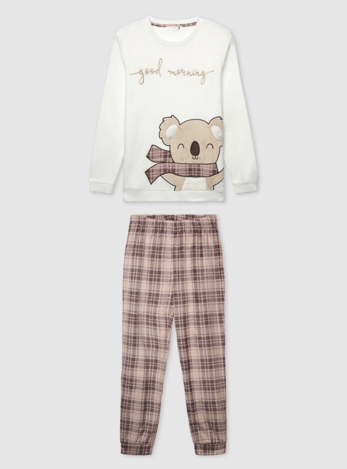 Set pigiama da donna con maglia a maniche lunghe e scollo tondo, impreziosita dalla scritta ricamata “good morning” e grande applicazione koala sul davanti. Pantaloni lunghi a quadri con elastico in vita. Vestibilità regular fantasia con stampe e ricami. Ideale per serate rilassate e giornate di relax in casa, si abbina a vestaglia e pantofole per un look cozy.