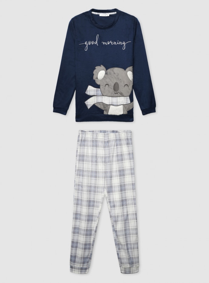 Set pigiama da donna con maglia a maniche lunghe e scollo tondo, impreziosita dalla scritta ricamata “good morning” e grande applicazione koala sul davanti. Pantaloni lunghi a quadri con elastico in vita. Vestibilità regular fantasia con stampe e ricami. Ideale per serate rilassate e giornate di relax in casa, si abbina a vestaglia e pantofole per un look cozy.