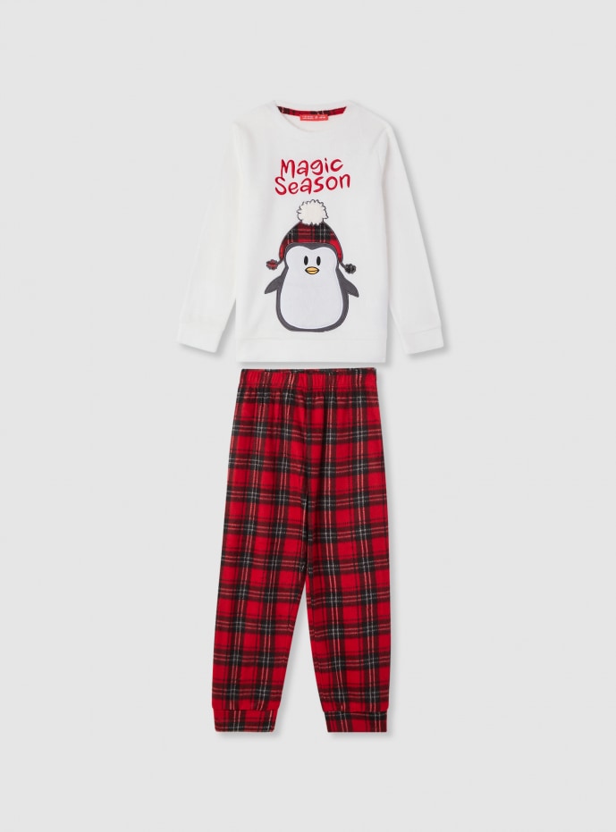 Pigiama da bambina in due pezzi con maglia a maniche lunghe e pantaloni lunghi. Maglia con girocollo, scritta “Magic Season” e grande pinguino applicato, perfetta per le serate invernali. Pantaloni a fantasia a quadri con vita elasticizzata e fondo con polsini per stare comodi. Ideale per il relax in casa o per le vacanze, facile da abbinare a calzini antiscivolo o vestaglia coordinata.