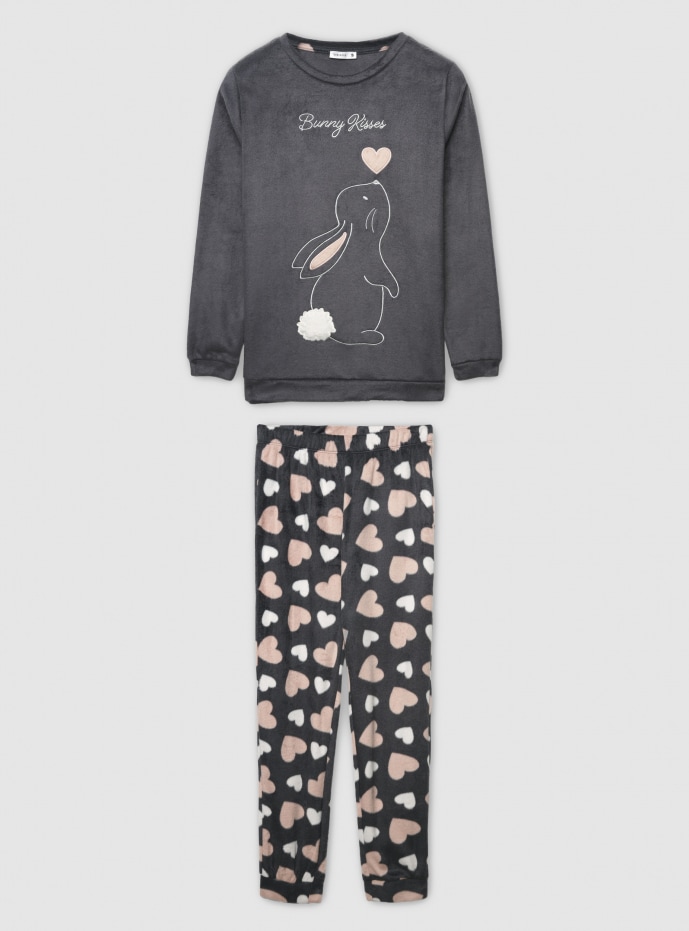Pigiama da donna con maglietta a maniche lunghe in tessuto morbido e stampa con scritta e applicazioni a rilievo. Girocollo e polsini lavorati per un fit confortevole durante il relax. Pantaloni lunghi con stampa cuori. Perfetto per le serate a casa, ideale per chi cerca comfort e stile nelle notti d’inverno.