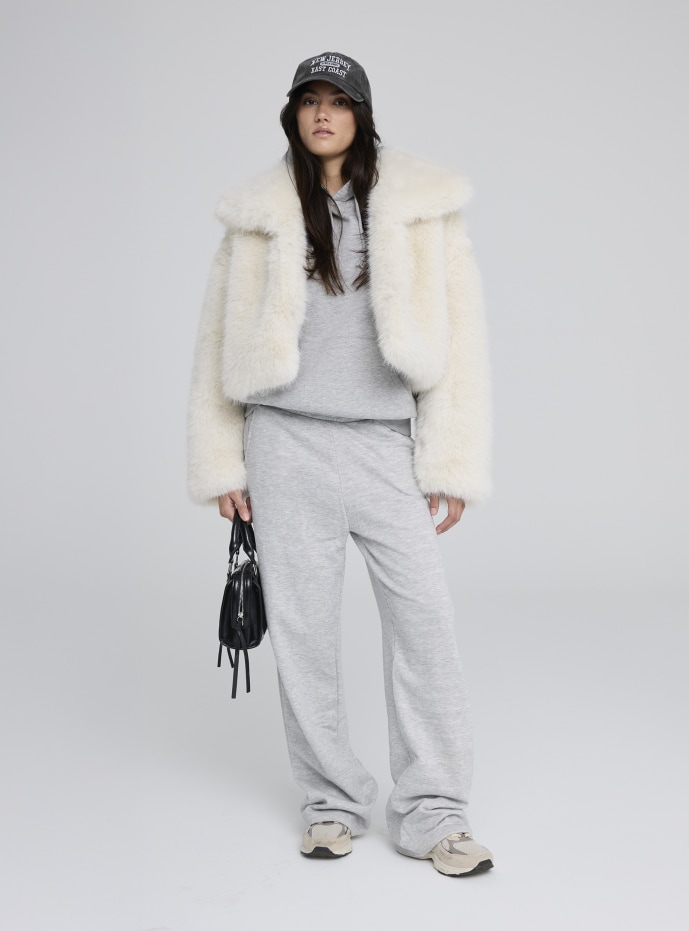 Giacca da donna in similpelliccia con collo ampio e maniche lunghe, ideale per aggiungere un tocco sofisticato a un outfit casual o per occasioni speciali. La giacca presenta una vestibilità regolare e un design elegante, con chiusura frontale per praticità. Caratterizzata da una vestibilità regolare e una chiusura frontale pratica, si distingue per la sua texture soffice e avvolgente che dona comfort e stile. Perfetto per abbinamenti con pantaloni o gonne.