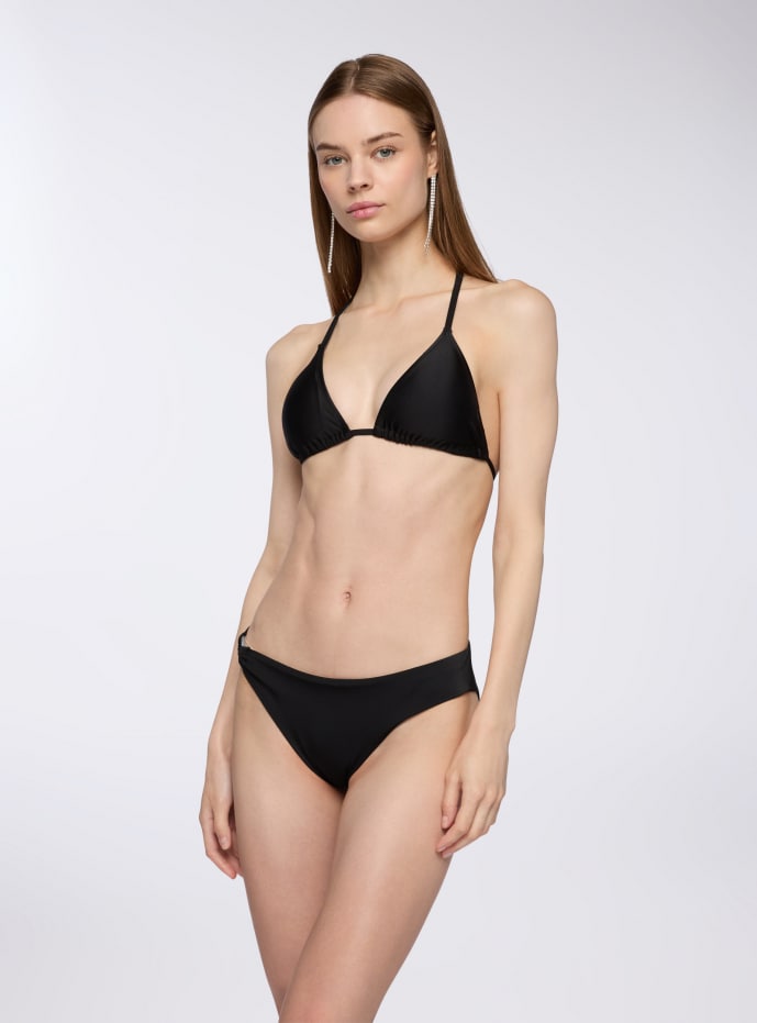 Slip bikini da donna, ideale per chi cerca un look femminile e di tendenza in spiaggia o in piscina. Il design minimal è valorizzato da un anello a forma di cuore con effetto luccicante su un fianco, dettaglio che aggiunge un tocco glamour. Perfetto da abbinare a reggiseni coordinati o mix&match, offre una vestibilità regolare e una silhouette valorizzata. Fantasia a tinta unita con stampa logo sul retro.