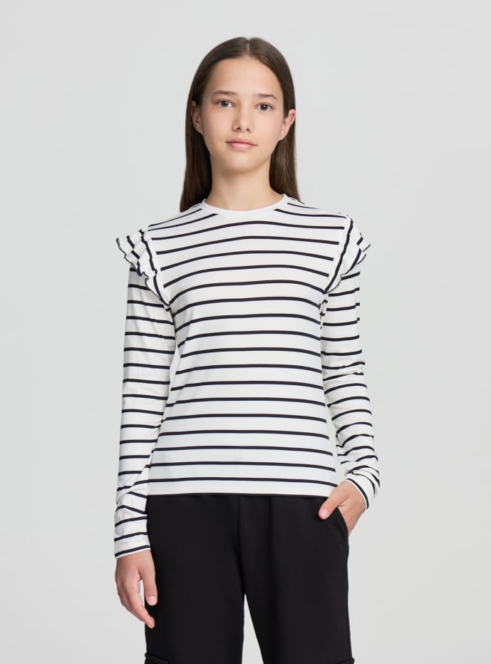 Maglietta da bambina a righe con maniche lunghe con volant sulle spalle. Presenta un design a righe orizzontali che aggiunge un tocco di stile marinaro. Le maniche lunghe la rendono ideale per le giornate più fresche, mentre il taglio regolare assicura una vestibilità comoda. Perfetta per abbinamenti casual con jeans o pantaloni sportivi, adatta per la scuola o il tempo libero.