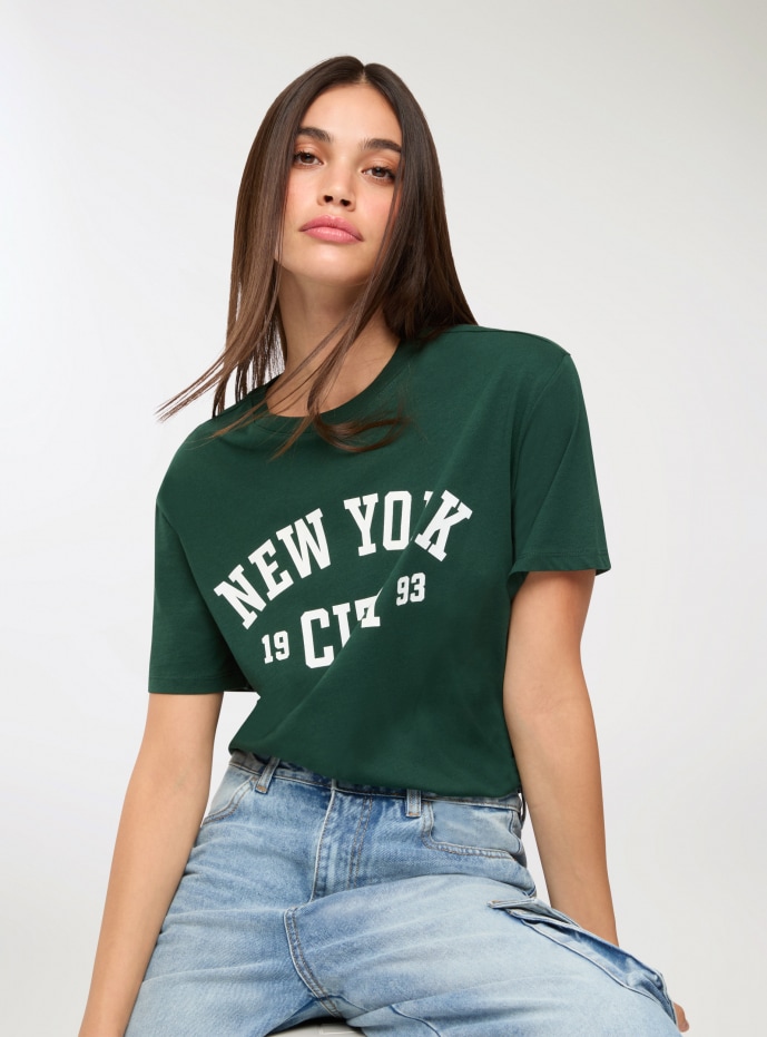 Maglietta da donna con vestibilità ampia, ideale per un look casual e rilassato. Perfetta per il tempo libero, si abbina facilmente a jeans o pantaloncini per un outfit comodo e alla moda. Il design con stampa college aggiunge un tocco di stile urbano, rendendola adatta a diverse occasioni informali.