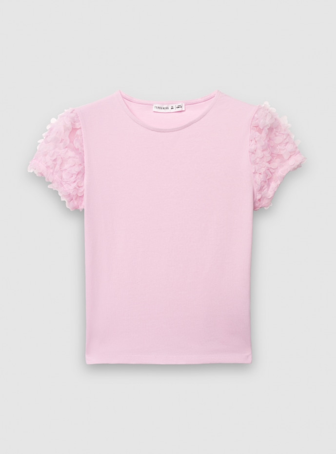 Maglietta da bambina a tinta unita con girocollo e maniche corte in tulle decorato a petali, ideale per look quotidiani con un tocco romantico. Perfetta da abbinare a jeans, gonne o pantaloncini per uscite, feste e scuola. Le maniche leggermente voluminose aggiungono movimento e rendono il capo versatile per molte occasioni.