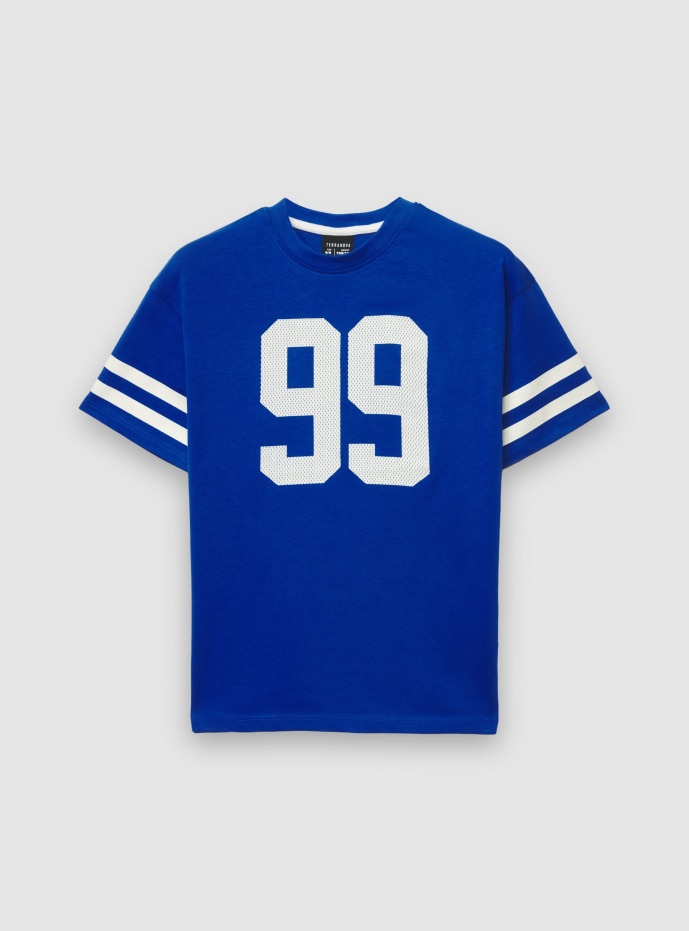 Maglietta da bambino con stampa numerica sul davanti e maniche corte decorate da doppie righe, perfetta per un look sporty. Collo tondo e vestibilità regular, ideale per la scuola o il tempo libero. Si abbina facilmente a jeans, pantaloncini o joggers per outfit dinamici.