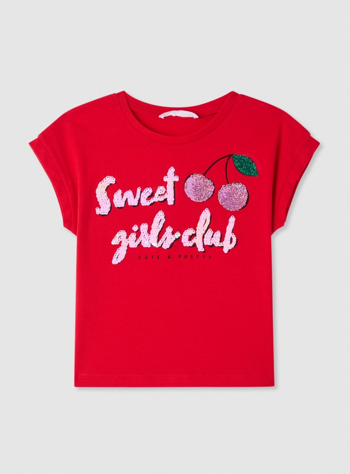 Maglietta da bambina con scollo tondo e maniche corte a kimono. La grafica frontale presenta scritta e ciliegie decorate con paillettes a effetto luccicante, ideale per look casual e per il tempo libero. Taglio regular che si abbina facilmente a jeans, gonne o pantaloncini. Fondo dritto e nessuna chiusura. Stile a stampa, perfetta per aggiungere un tocco divertente agli outfit quotidiani.