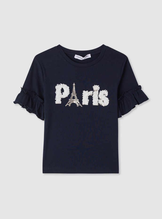 Maglietta da bambina con maniche corte a balze e girocollo. La grafica frontale presenta una scritta applicata con dettagli di petali in rilievo, ideale per aggiungere un tocco divertente agli outfit quotidiani. Perfetta con jeans, shorts o una gonna, offre una vestibilità comoda e facile da indossare per la scuola e il tempo libero.