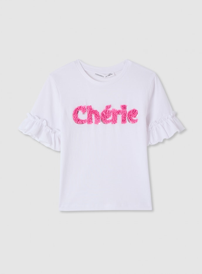 Maglietta da bambina con maniche corte a balze e girocollo. La grafica frontale presenta una scritta applicata con dettagli di petali in rilievo, ideale per aggiungere un tocco divertente agli outfit quotidiani. Perfetta con jeans, shorts o una gonna, offre una vestibilità comoda e facile da indossare per la scuola e il tempo libero.