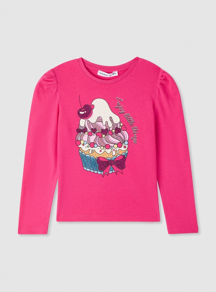 Maglietta da bambina a maniche lunghe con arricciatura sulle spalle e con una stampa vivace di un cupcake decorato con dettagli glitterati e scritta "Enjoy little things". Ideale per un look casual, divertente e colorato, si abbina perfettamente a jeans o pantaloni sportivi per un outfit comodo e allegro. La vestibilità regolare e il design accattivante la rendono perfetta per il tempo libero e le giornate di gioco.