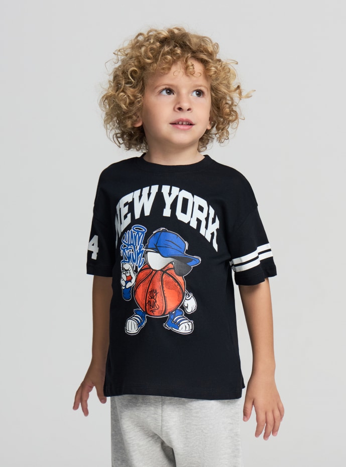 Maglietta da bimbo con stampa grafica ispirata a New York. Modello a maniche corte con girocollo, ideale per un look casual e sportivo. Perfetta per abbinamenti con jeans o pantaloncini per un outfit comodo e alla moda. La stampa vivace aggiunge un tocco di personalità, rendendola adatta per il tempo libero e le attività quotidiane.