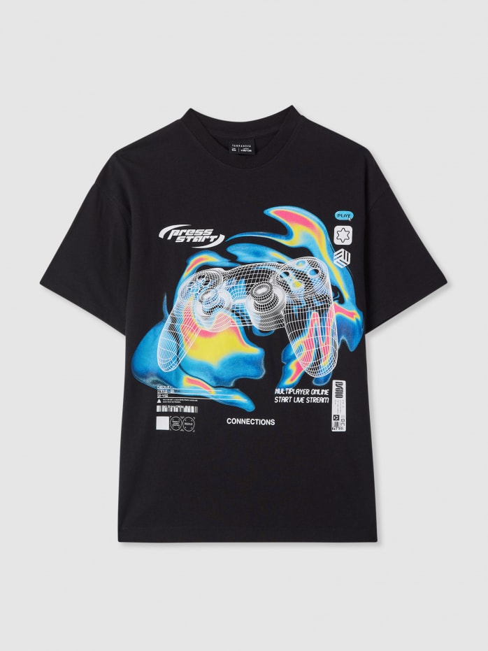 Maglietta da bambino con grafica videogame sul davanti. Modello a maniche corte e girocollo, ideale per il tempo libero e la scuola. Vestibilità regular che si abbina facilmente a jeans o pantaloncini per un look urbano. La stampa con console, scritte e dettagli digitali aggiunge un tocco trendy.