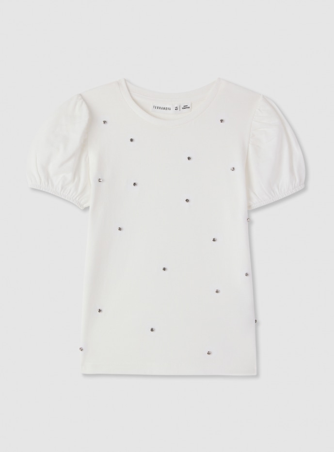 Maglietta da bambina a maniche corte con girocollo e vestibilità regular. Il davanti è impreziosito da piccole applicazioni brillanti distribuite a pois, mentre le maniche a palloncino con arricciature e fondo elasticizzato aggiungono un tocco femminile. Perfetta per la scuola e il tempo libero, si abbina a jeans o gonne per look versatili.