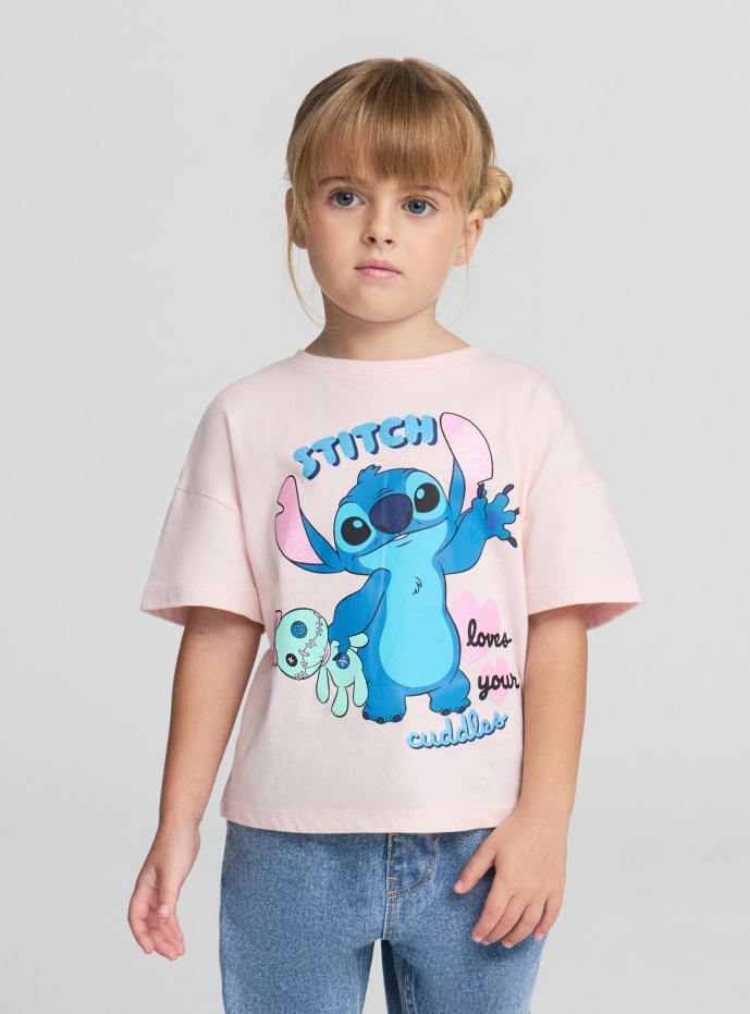 Maglietta da bimba a maniche corte con stampa Stitch®, ideale per look casual e versatili. Il modello presenta una vestibilità regular. Il girocollo conferisce comfort e praticità, perfetta da abbinare a jeans, pantaloncini o gonne per la scuola e il tempo libero.