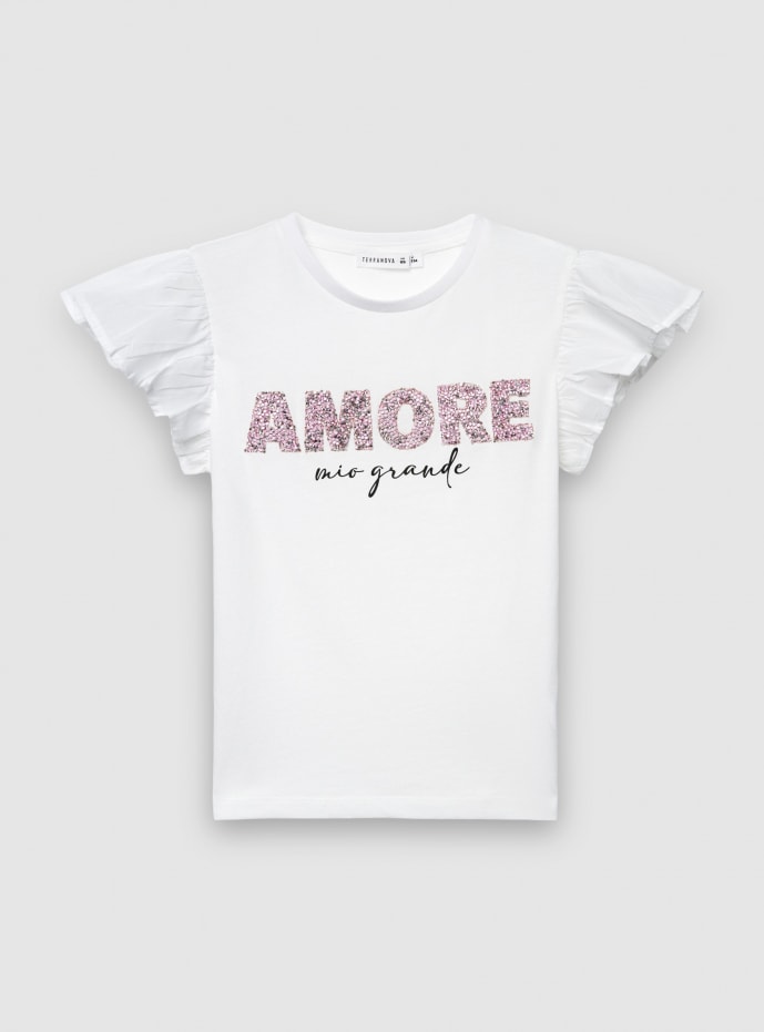 T-shirt maniche a balze e scritta glitter Bianco ottico