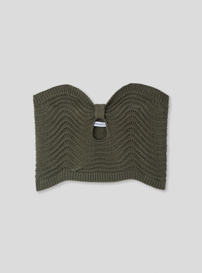 Top da donna a fascia, ideale per un look estivo e casual. La lavorazione a maglia crea un design unico e accattivante, perfetto per essere abbinato a pantaloni o gonne a vita alta. La vestibilità aderente valorizza la silhouette, mentre il design senza spalline offre un tocco moderno e versatile. Perfetto per occasioni informali o per completare un outfit da giorno.