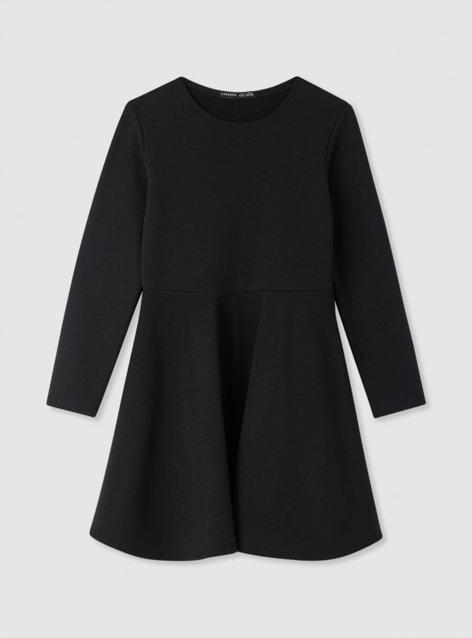 Abito da bambina a tinta unita con linea svasata e gonna a ruota, ideale per look daily chic o per occasioni speciali come cerimoni e feste di compleanno. Collo tondo e maniche lunghe. Facile da abbinare a sneakers per un look quotidiano o con ballerine per occasioni più speciali. Design essenziale che si presta a sovrapposizioni con cardigan o giacchini corti.