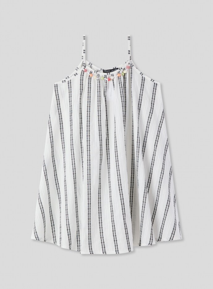 Abito da bambina con fantasia a righe, ideale per giornate estive e occasioni casual. Presenta un design senza maniche con spalline sottili e dettagli decorativi sul girocollo. La vestibilitá ampia garantisce comfort e libertá di movimento, rendendolo perfetto per essere abbinato a sandali o scarpe sportive per un look fresco e giocoso.