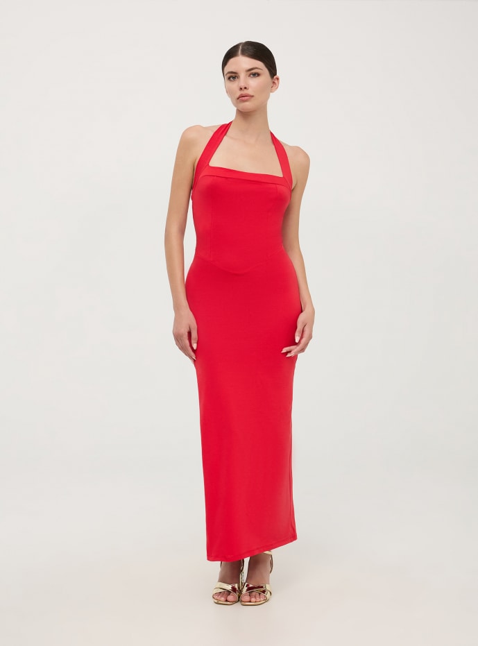 Abito lungo da donna a tinta unita con un elegante design con allacciatura dietro al collo, che aggiunge un tocco di raffinatezza e sensualità. La scollatura dritta e il taglio aderente valorizzano la silhouette, mentre il tessuto in jersey assicura comfort e una vestibilità perfetta. La lunghezza del vestito arriva fino alle caviglie, rendendolo adatto per occasioni formali o serate speciali. Questo capo è perfetto per chi cerca un look sofisticato e femminile, ideale da abbinare con accessori minimalisti per completare l'outfit.
