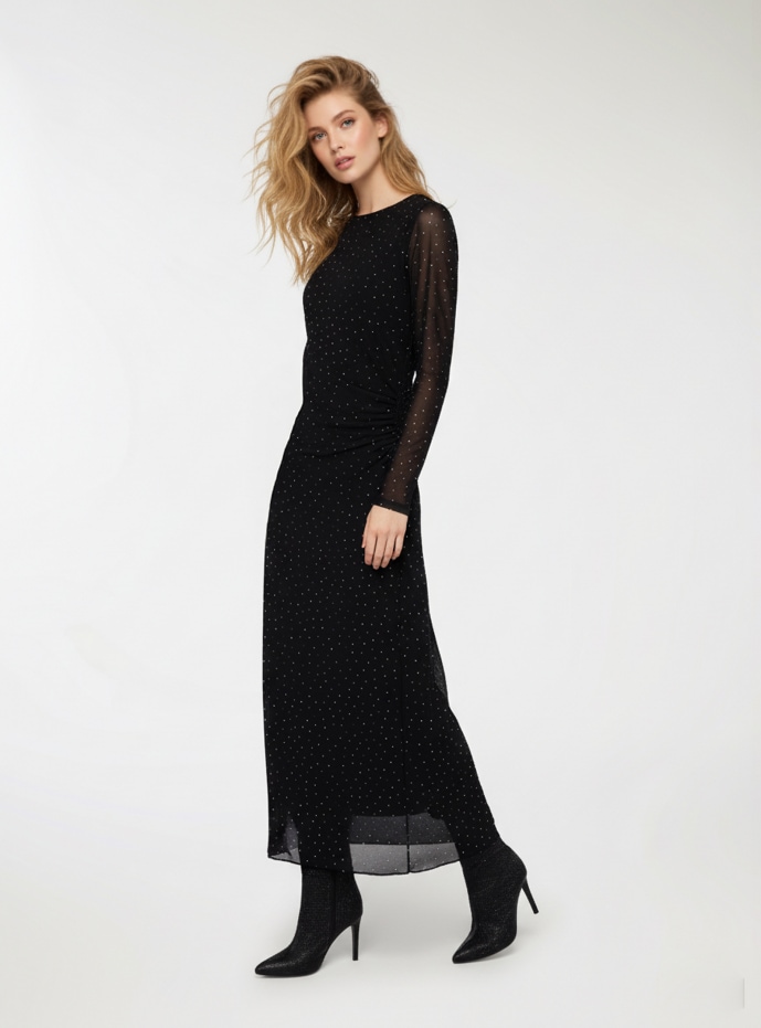 Abito da donna lungo a maniche lunghe, ideale per serate ed eventi. Collo girocollo e vestibilità regular, impreziosito da strass all-over dall’effetto luccicante che illumina il movimento. Dettaglio di arriccio sul fianco che valorizza la silhouette. Facile da abbinare a décolleté o stivaletti e pochette per un look impeccabile.