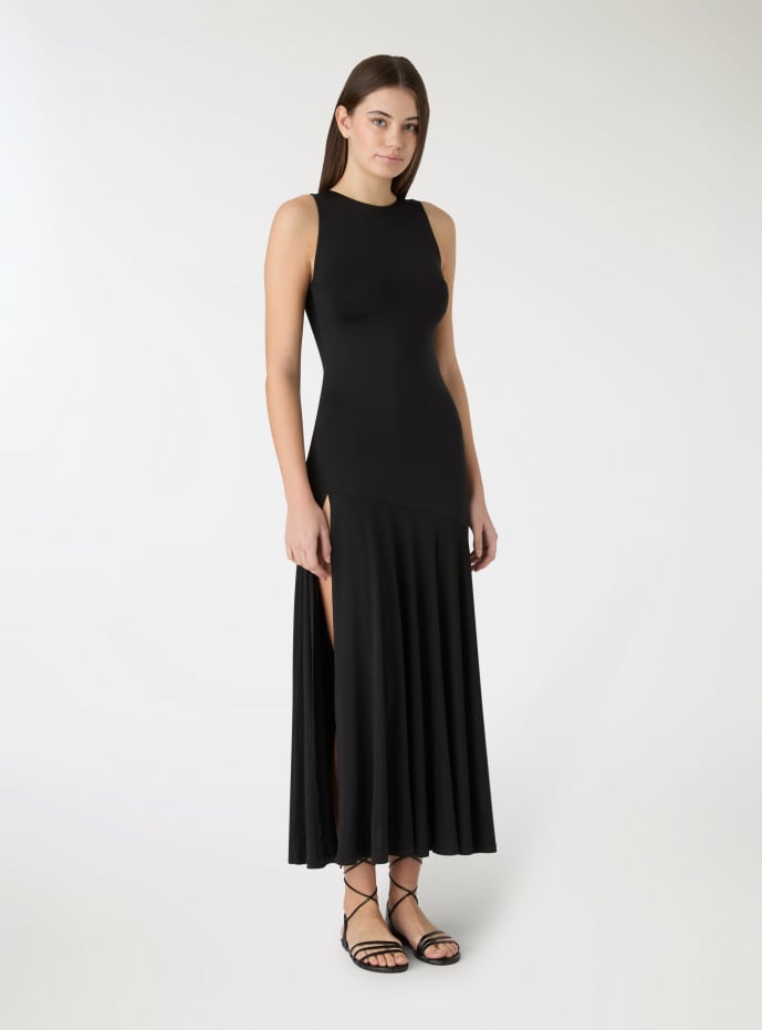 Abito da donna lungo a tinta unita con linea svasata e taglio asimmetrico in vita che valorizza la figura. Modello senza maniche con scollo tondo, perfetto per serate ed eventi eleganti. Il corpino segue il busto, mentre la gonna ampia dona movimento. Da abbinare a sandali alti e clutch per un look raffinato, oppure a blazer per un tocco formale.