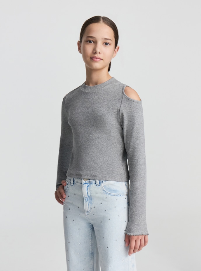 Girls' long-sleeve T-shirt with a modern design. It features a cut-out detail that leaves the shoulders bare, adding a unique touch of style. Ideal for casual and fashionable outfits, it pairs perfectly with jeans or trousers for a versatile look. Crop fit, suitable for various occasions. Made from solid-colour ribbed fabric.