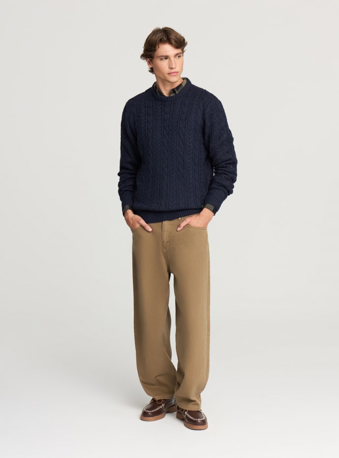 Men’s crew neck jumper with a solid colour cable knit pattern. Long sleeves and ribbed edges on the neck, cuffs, and hem for a comfortable fit. Perfect with jeans or chinos for casual wear, it also pairs well with shirts for a more polished look.
