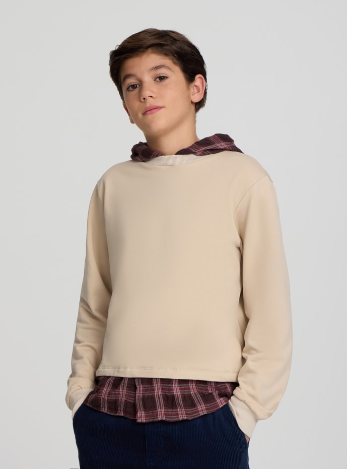 Children's hoodie, ideal for school and leisure. Long-sleeved lined model with elasticated cuffs. The hood and hem feature a checkered insert that adds a trendy touch and is easy to pair with jeans or jogger trousers. Comfortable fit and straight cut for everyday use, perfect for layering over a t-shirt in the transitional seasons.
