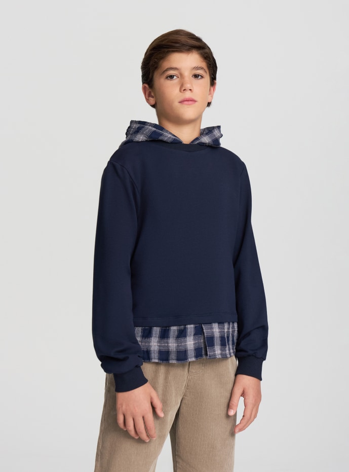Children's hoodie, ideal for school and leisure time. Double-layered long-sleeve design with elasticated cuffs. The hood and hem feature a checkered insert that adds a trendy touch and is easy to pair with jeans or jogger trousers. Comfortable fit and straight cut for everyday use, perfect for layering over a t-shirt in the transitional seasons.