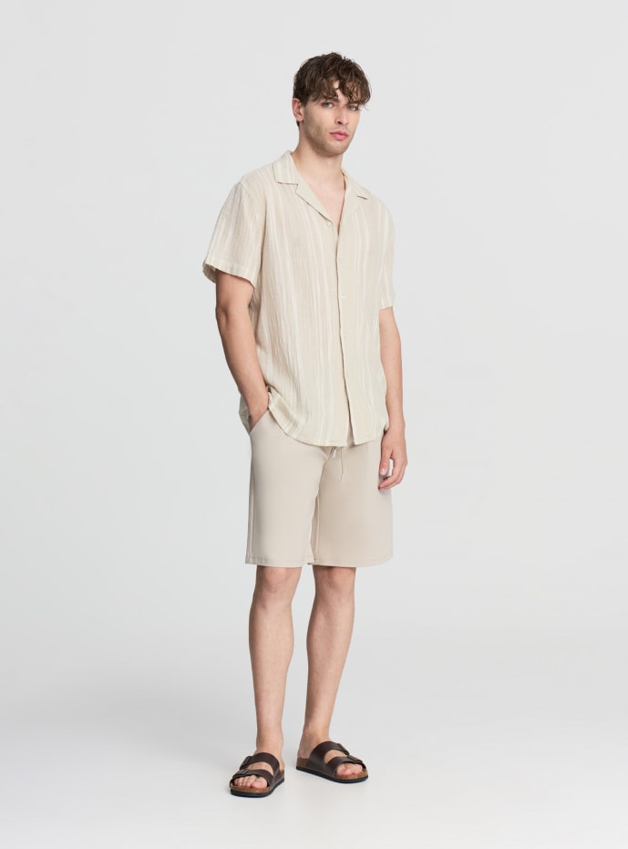 Men's solid colour shorts with a short leg and adjustable drawstring waist. Featuring comfortable side pockets, ideal for leisure time, summer walks, or casual looks. Perfect to pair with a t-shirt or polo for a fresh and relaxed outfit.