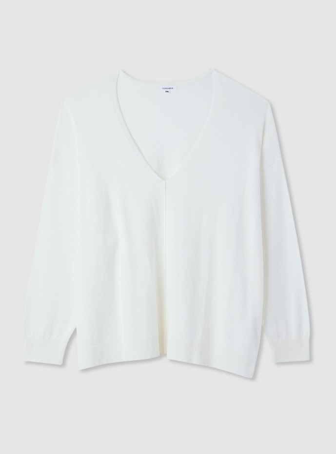 Women's long-sleeve top with a V-neck, featuring a solid colour design that makes it versatile and suitable for various occasions. The comfortable fit and simple yet elegant cut make it ideal to pair with jeans or smart trousers, perfect for work or leisure. An essential piece for a casual and refined look.