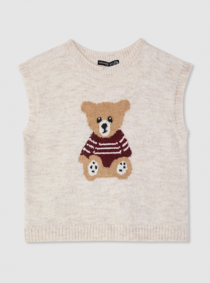 Girls' vest with a teddy bear on the front. Features a round neckline and ribbed trims on the collar, armholes, and hem, ideal for wearing over shirts or T-shirts for playful looks at school or during free time. Regular fit.