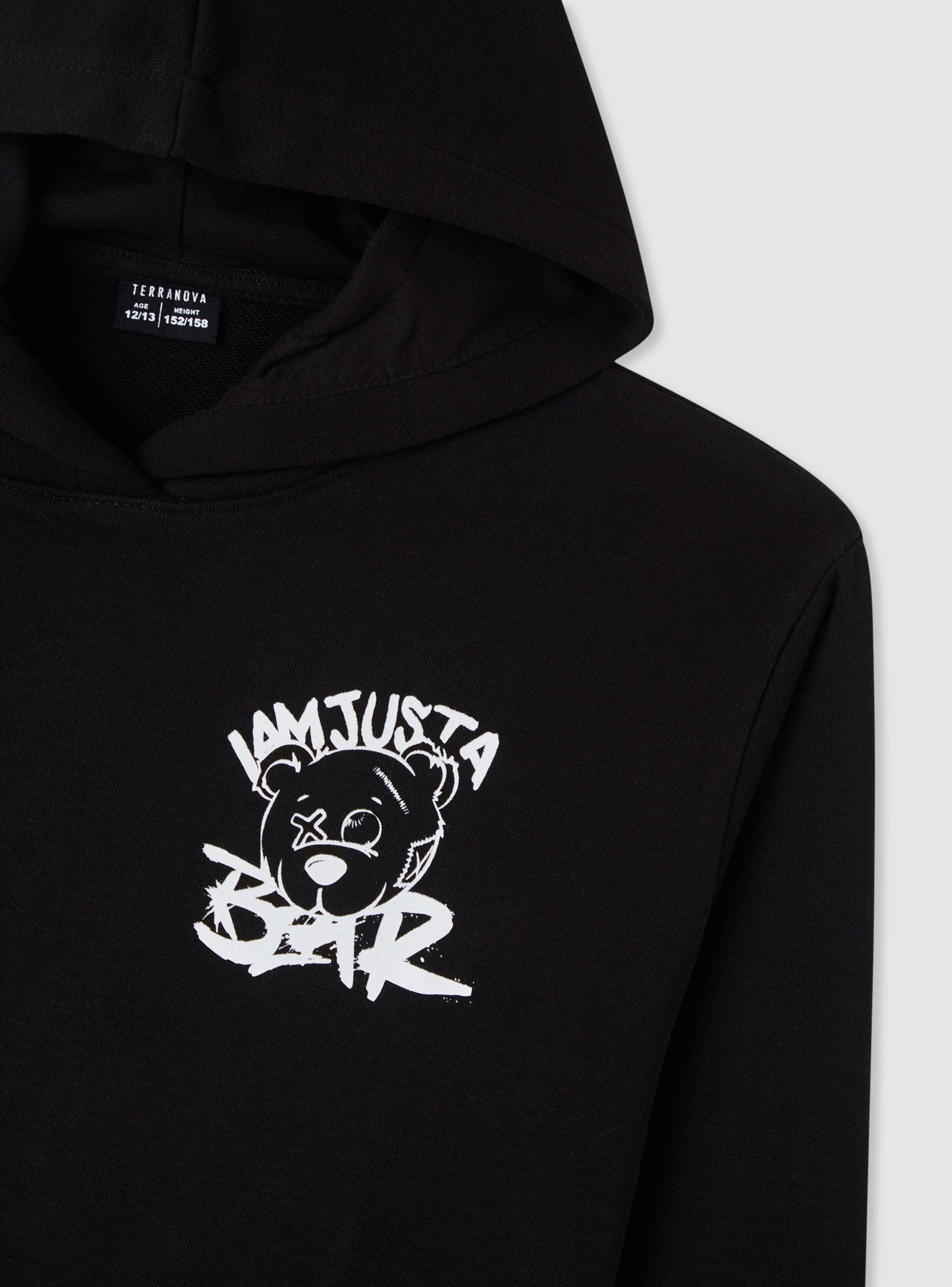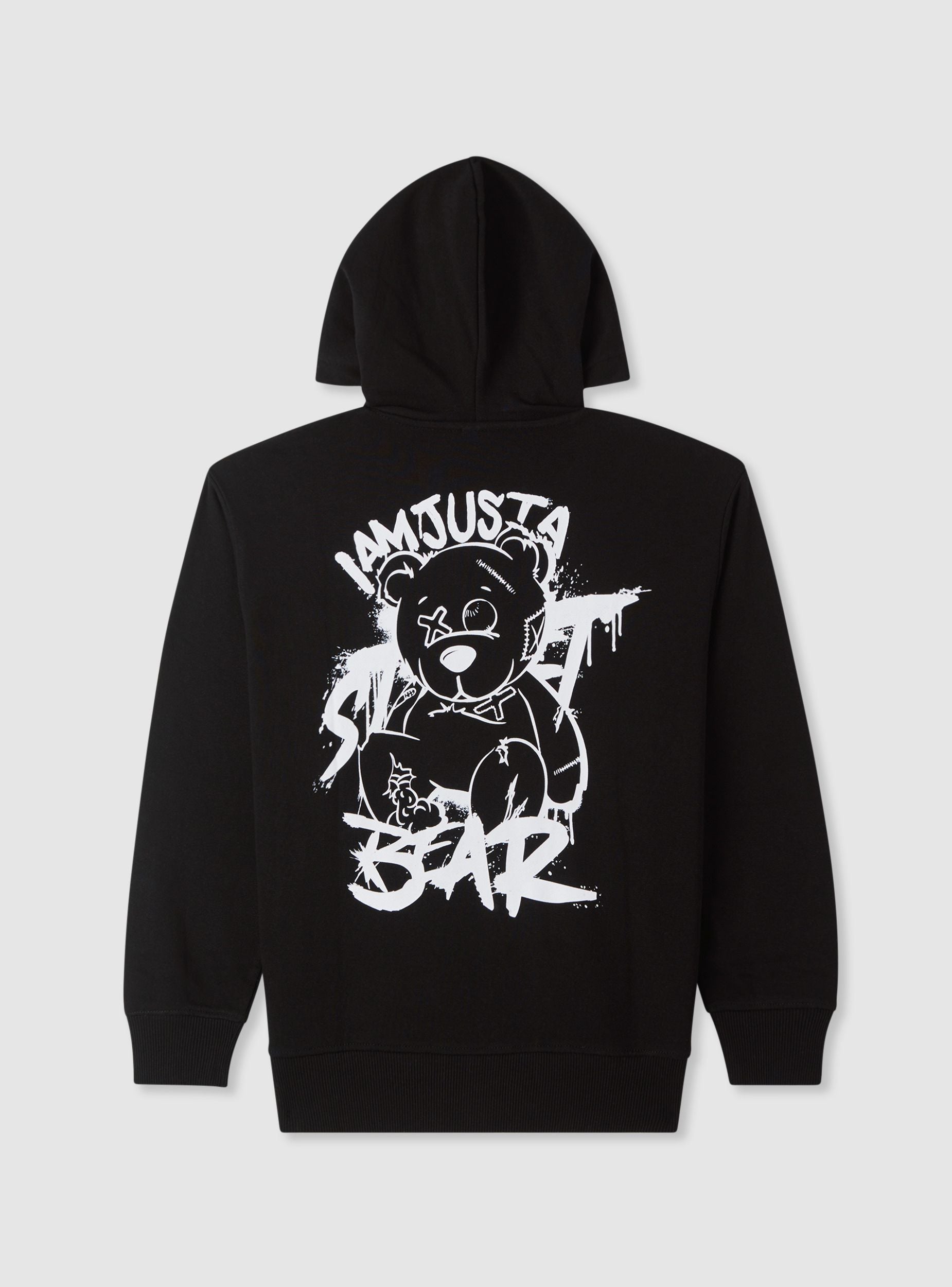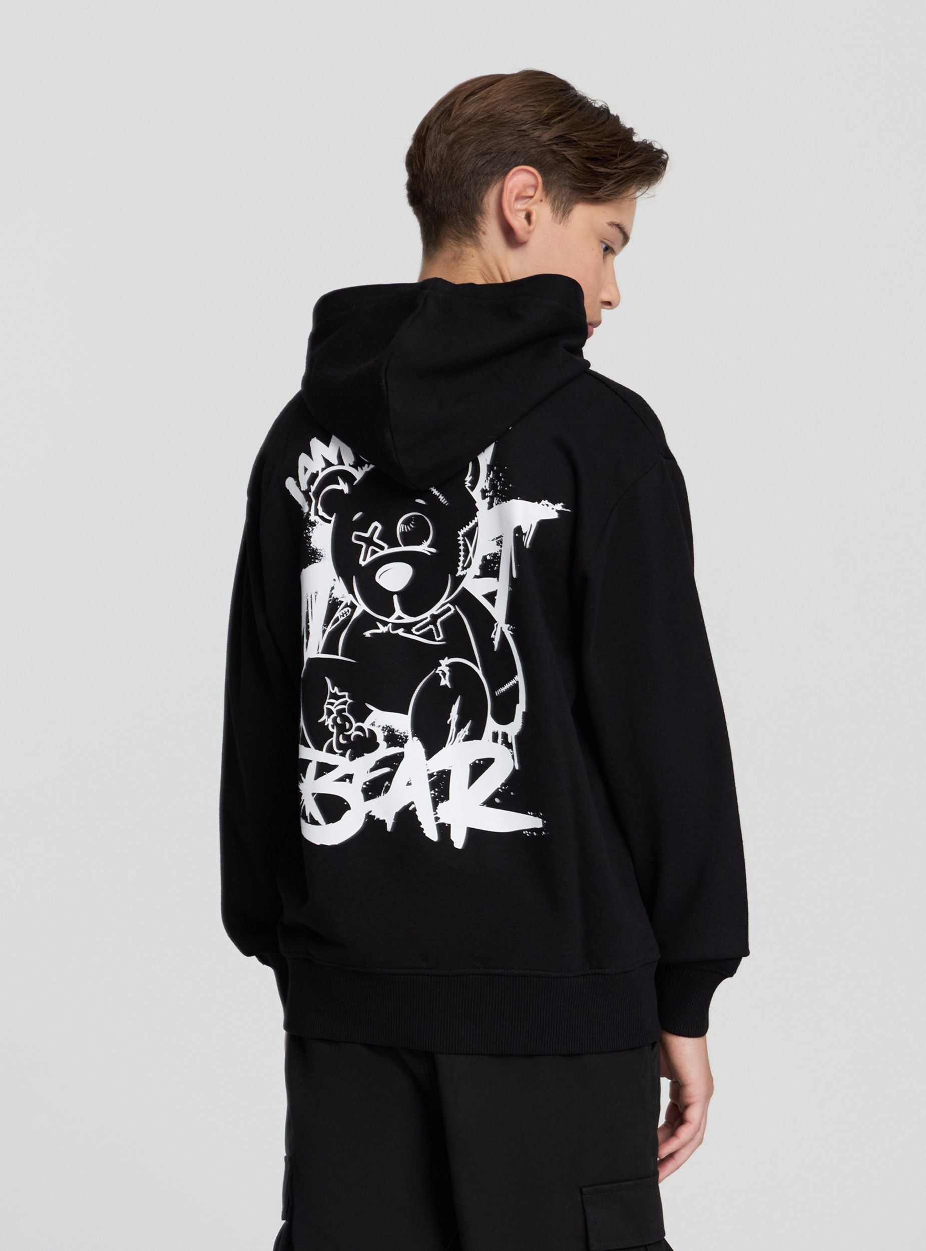 Lekka bluza dziecięca z kapturem, idealna na casualowy i wygodny look. Posiada graficzny nadruk z misiem z przodu i z tyłu, dodając zabawny i oryginalny akcent. Wyposażona w kieszeń kangurkę dla wygody oraz długie rękawy, które chronią przed zimnem. Doskonała do noszenia z jeansami lub spodniami sportowymi, odpowiednia na czas wolny i codzienne aktywności.Szczegóły