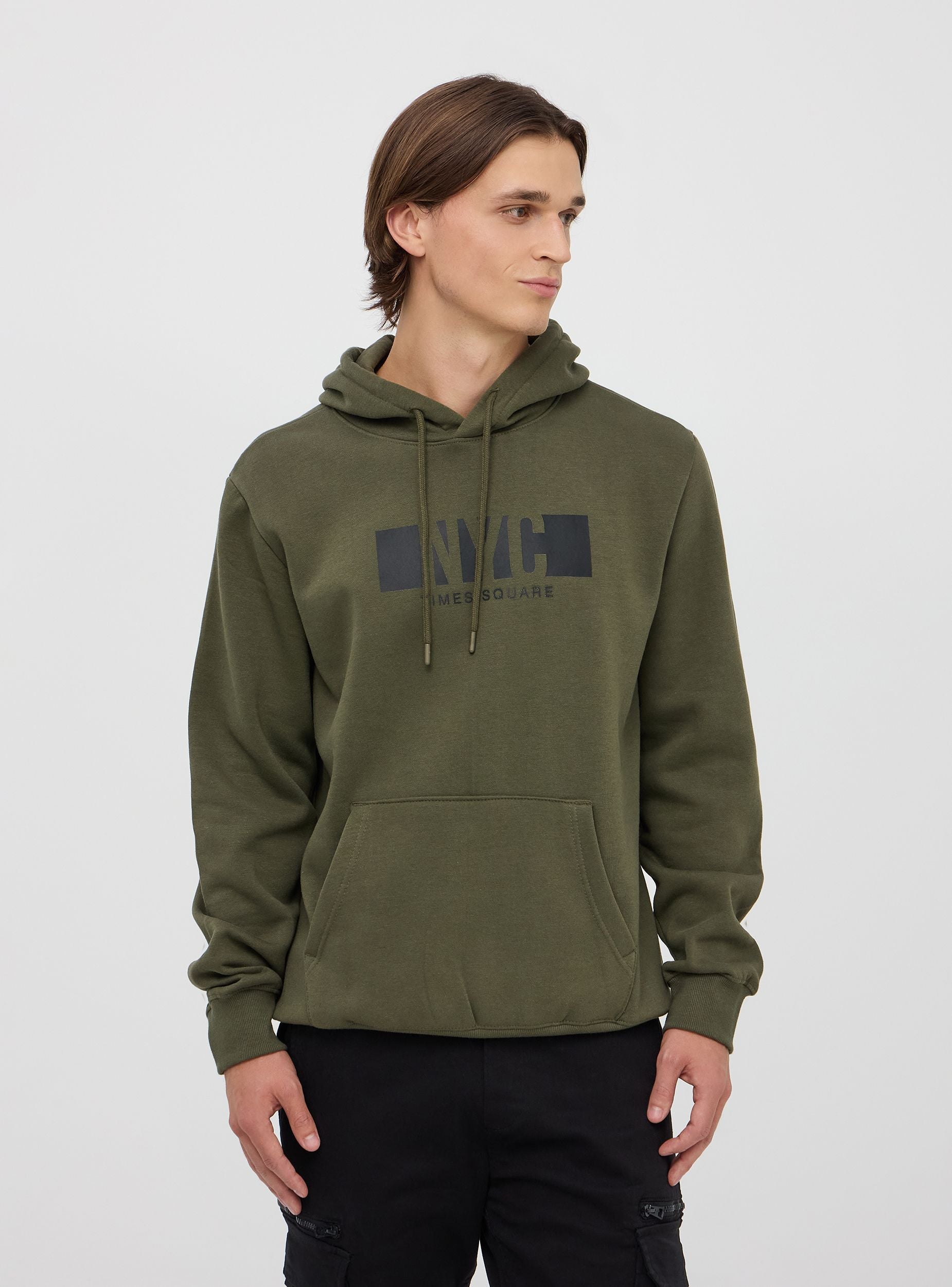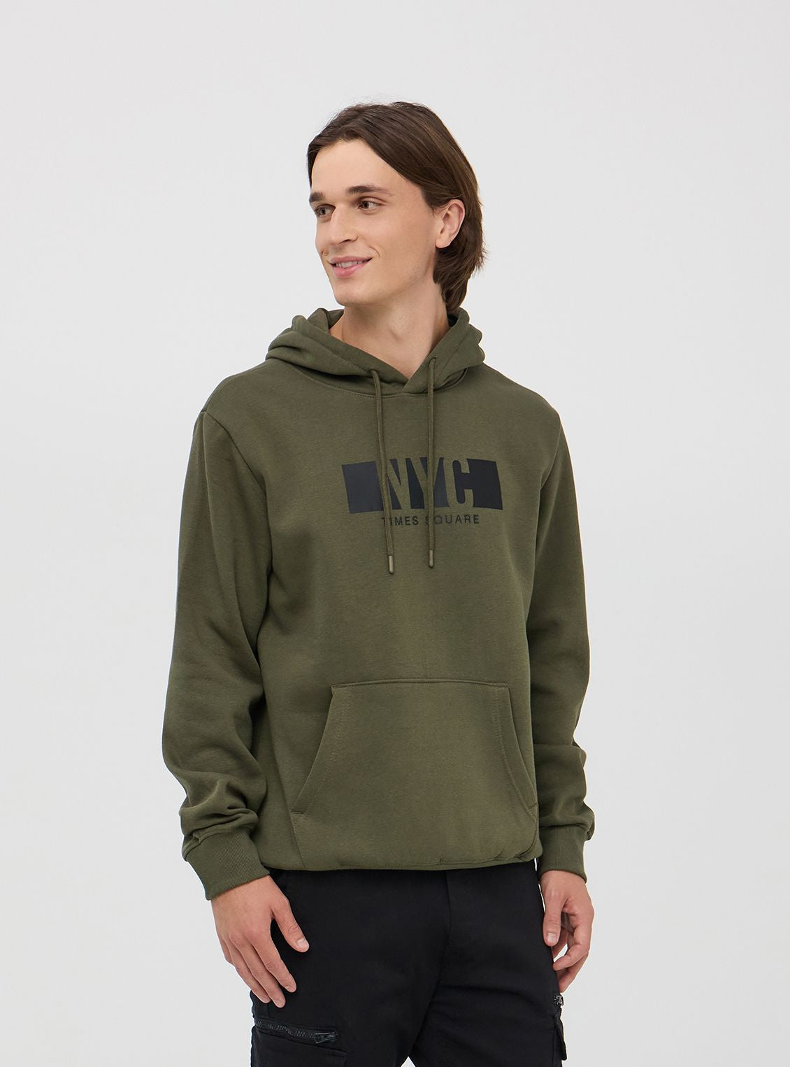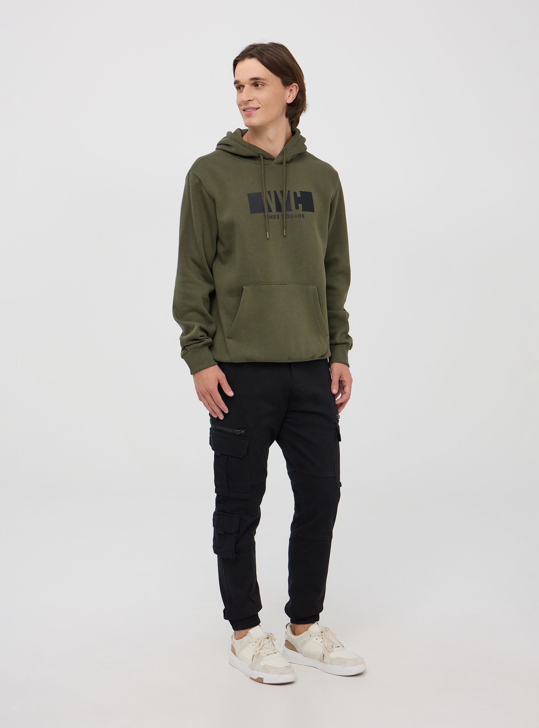 Męska bluza z kapturem i nadrukiem z przodu NYC. Wykonana z miękkiego, ciężkiego materiału, zapewnia optymalny komfort. Model zapinany, z regulowanym kapturem na sznurku, ściągaczami na rękawach i u dołu, oraz przednią kieszenią kangurką. Idealna na casualowy i sportowy look, łatwo łączy się z dżinsami lub spodniami sportowymi.Szczegóły