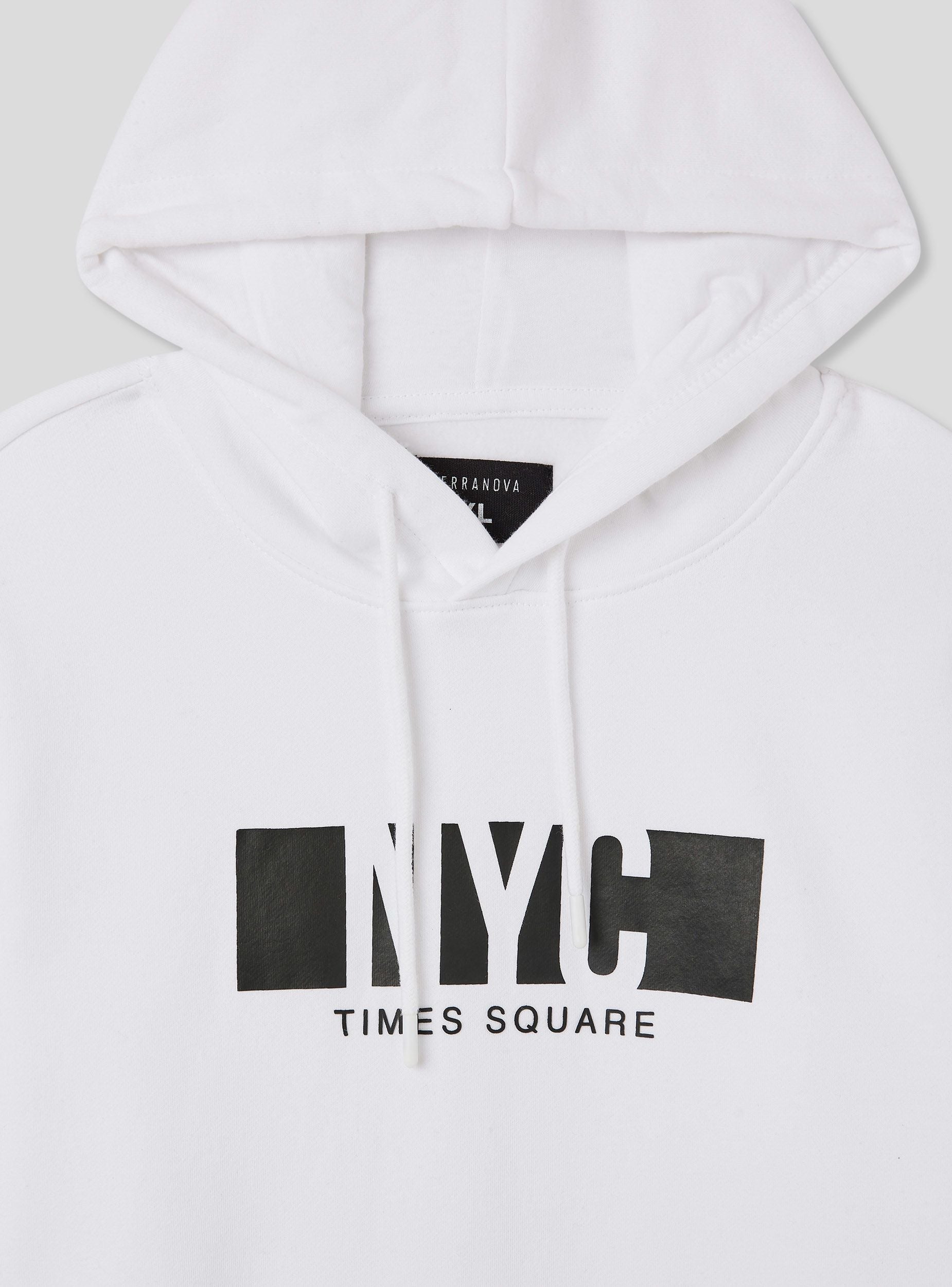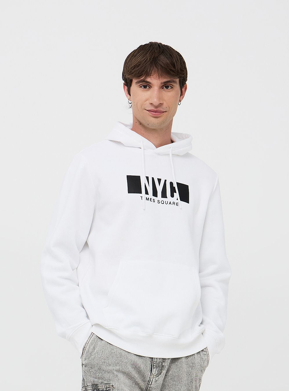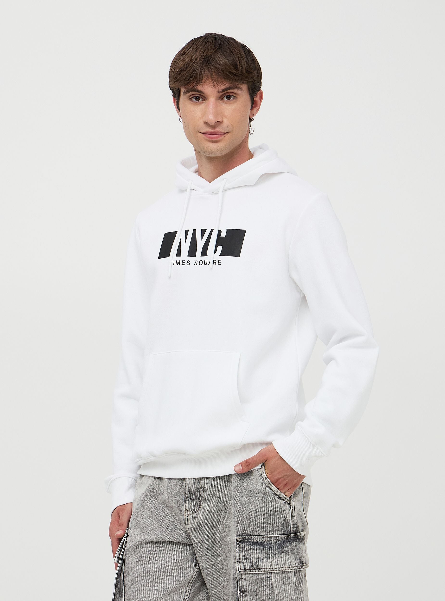 Męska bluza z kapturem i nadrukiem z przodu NYC. Wykonana z miękkiego, ciężkiego materiału, oferuje optymalny komfort. Model zapinany, wyposażony w regulowany kaptur ze sznurkiem, ściągacze i ribbowe wykończenie, oraz kieszeń typu kangur z przodu. Idealna na casualowy i sportowy look, łatwo łączy się z dżinsami lub spodniami sportowymi.Szczegóły